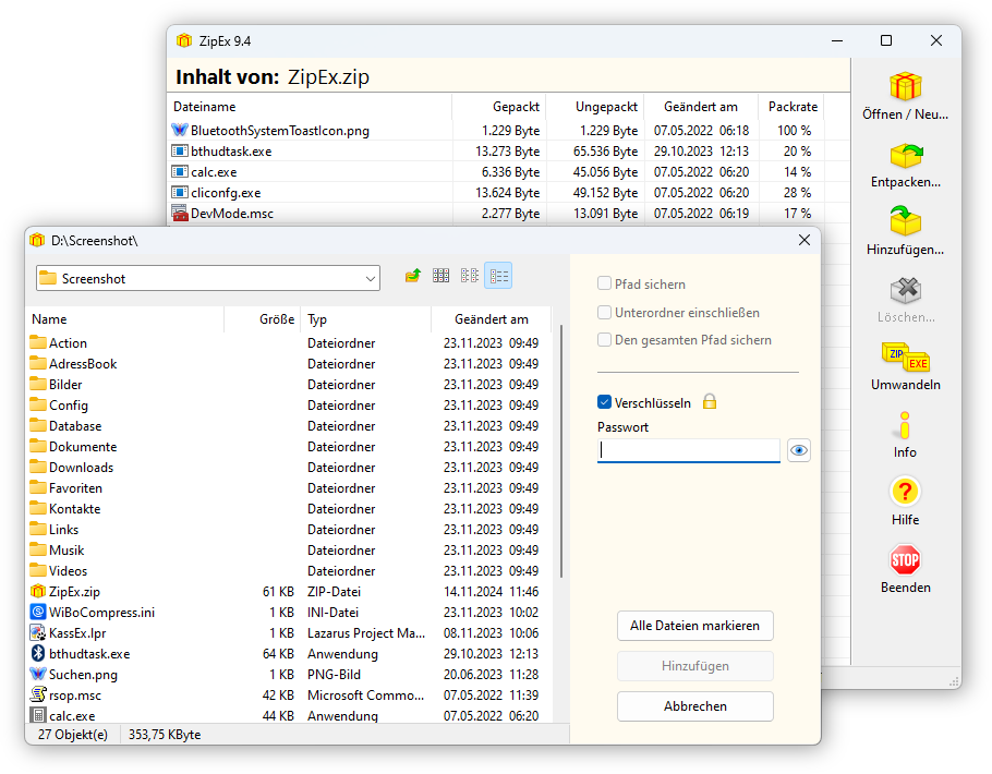 | Die gepackten Daten können mit dem integrierten Passwortschutz, gegen unberechtigte Nutzung gesichert werden. | |